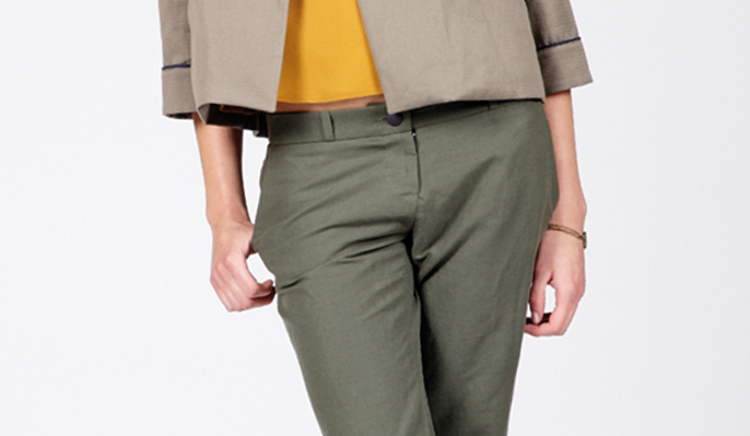 Pantalon droit, longueur 7/8ème. Bandes verticales contrastées aux côté type Smoking. Ceinture avec 1 bouton, braguette zipée et passants. Deux poches aux côtés et deux poches plaquées au Dos. Revers boutonné au bas du vêtement.